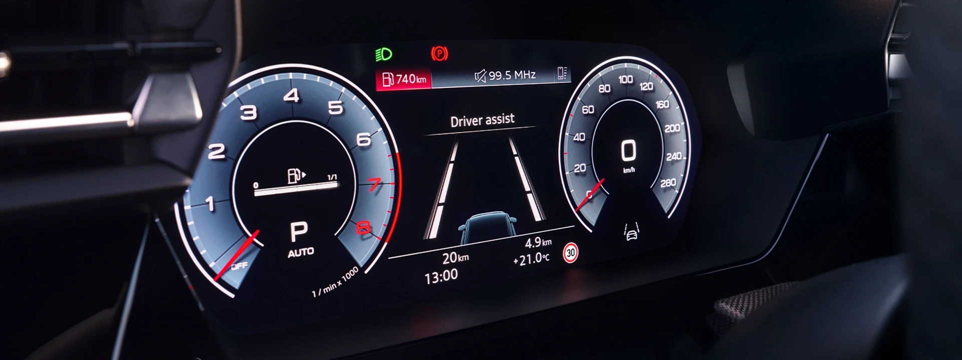 O Audi Virtual Cockpit Plus exibe as informações de condução mais importantes em uma das três variantes de layout, com operação personalizável, navegação de menu intuitiva e display orientado à direção.